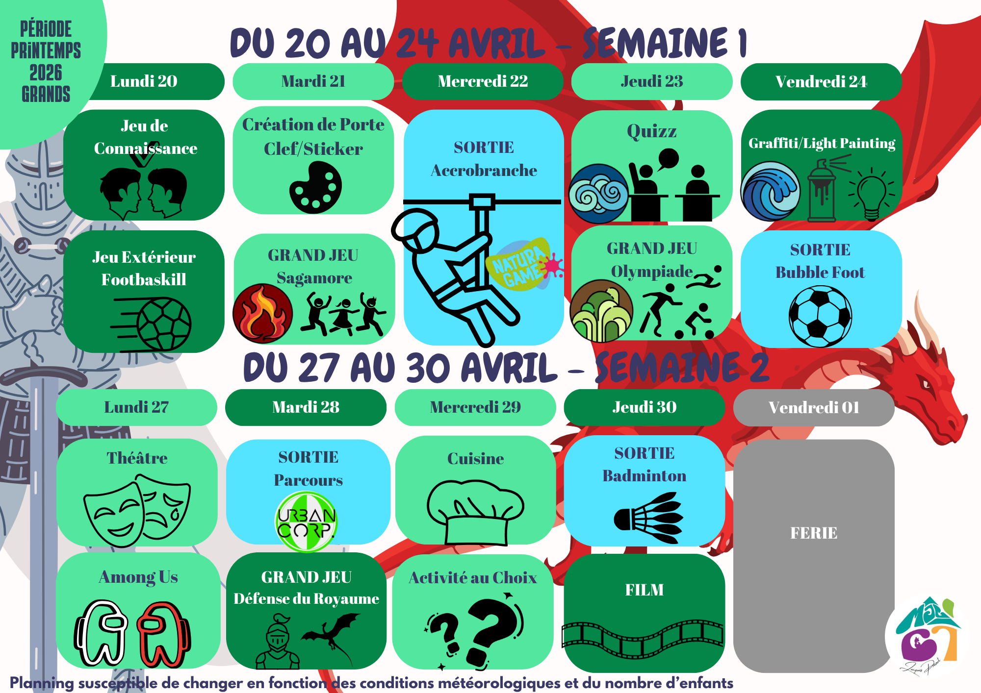 Accompagnez votre enfant à l’activité et assurez-vous de la présence de l’animateur. Pour le bon fonctionnement de l’activité, nous vous remercions de bien vouloir respecter les horaires des cours et de nous prévenir en cas d’absence.